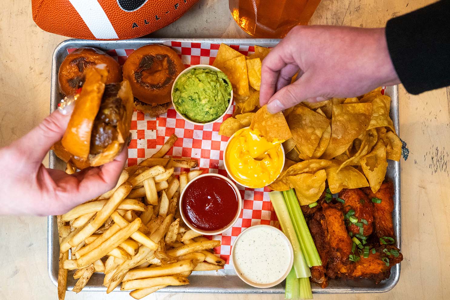 - Game Day Platter – 1lb of wings, 4 cheese burger sliders, tortilla chips, fries, nacho cheese, guacamole